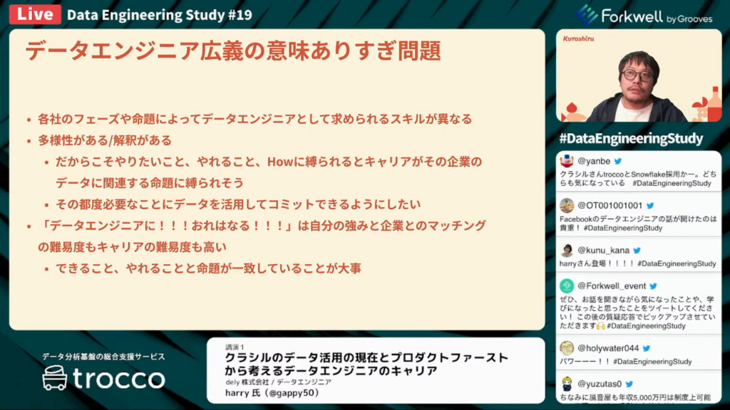 harry氏:「データエンジニアは、各社のフェーズや命題によって求められるスキルが異なるため、多様性のある職種だなとわかりました。