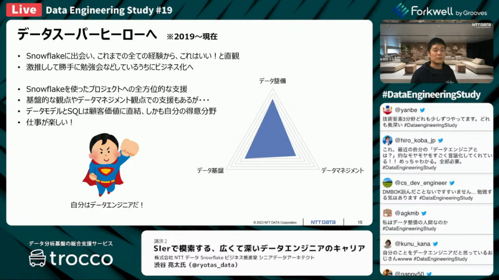 最近では仕事の楽しさに気づき、自分のことをデータエンジニアだと名乗っています。もちろん、これからもこの三角形をより広げていかなければならないと思っていますが、ある程度の力があるということで、データスーパーヒーローとしてさまざまなご支援をさせていただいている状況です。」