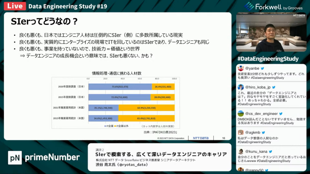 2023年DX白書でも出てきているのですが、日本とアメリカで大きく異なります。日本ではIT企業側に圧倒的にエンジニアがいるため、良くも悪くも現実として、エンタープライズの現場で相手を回してるのはSIerだと思っています。これはデータエンジニアであっても同じ状況だと、感覚的に思っています。