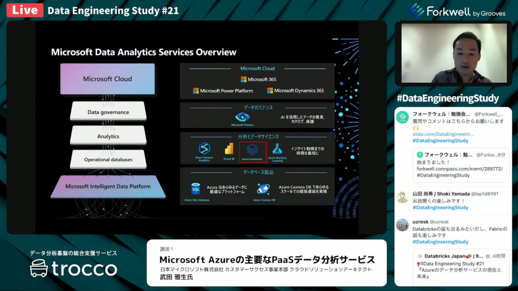 前半の講演では、日本マイクロソフト株式会社 カスタマーサクセス事業本部 クラウドソリューションアーキテクトの武田雅生氏に、データ分析基盤でよく使われるPaaSサービス群に焦点を当て、それぞれの特長を詳しく解説していただきます。