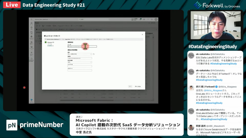 中里氏:「つづいて、同じようにAmazon S3にあるDelta Lakeのデータもショートカットとして登録していきます。S3のバケットのURLを入力します。アイアムのユーザー情報は、すでに入れているため、それを接続の資格情報として使い、次に進みます。」