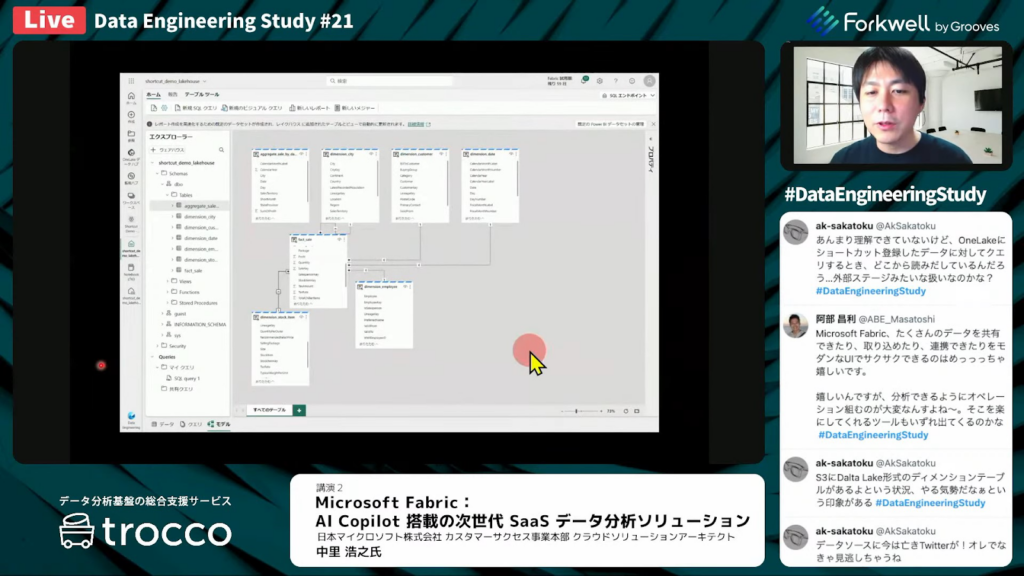 中里氏:「Fabricの面白い点は、Power BIをベースとしています。テーブル間のリレーションをGUIを使って、マッピングできます。たとえば、ドラッグ&ドロップ、GUIの操作で、ファクトテーブルとディメンションテーブルをキーで結びつけられます。