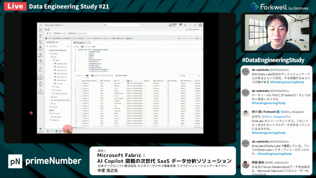 中里氏:「もちろん、OneLakeにあるデータをSQLを使って分析することもできます。「SQLエンドポイント」のメニューがあるため、こちらに切り替えるだけです。」