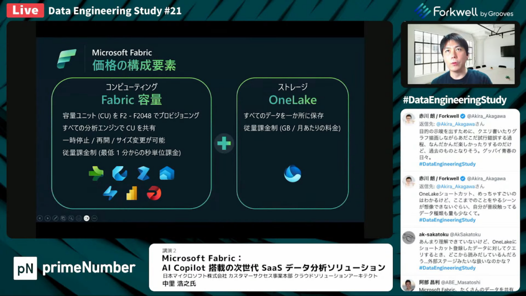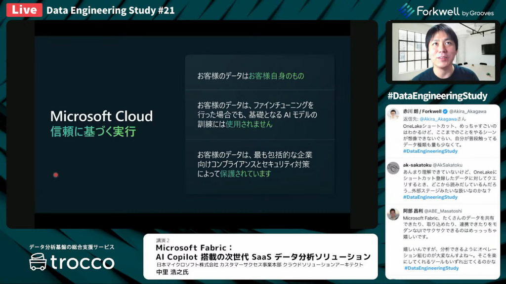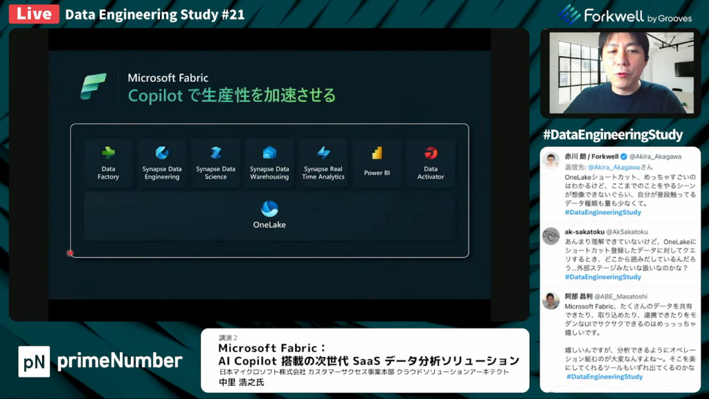 中里氏:「Microsoft Fabricでも、Copilotの機能がプライベートプレビューになっています。Fabricにはさまざまな分析のエンジンとOneLakeがありますが、全ての分析のエンジンでCopilotが使えるような形で開発を進めています。