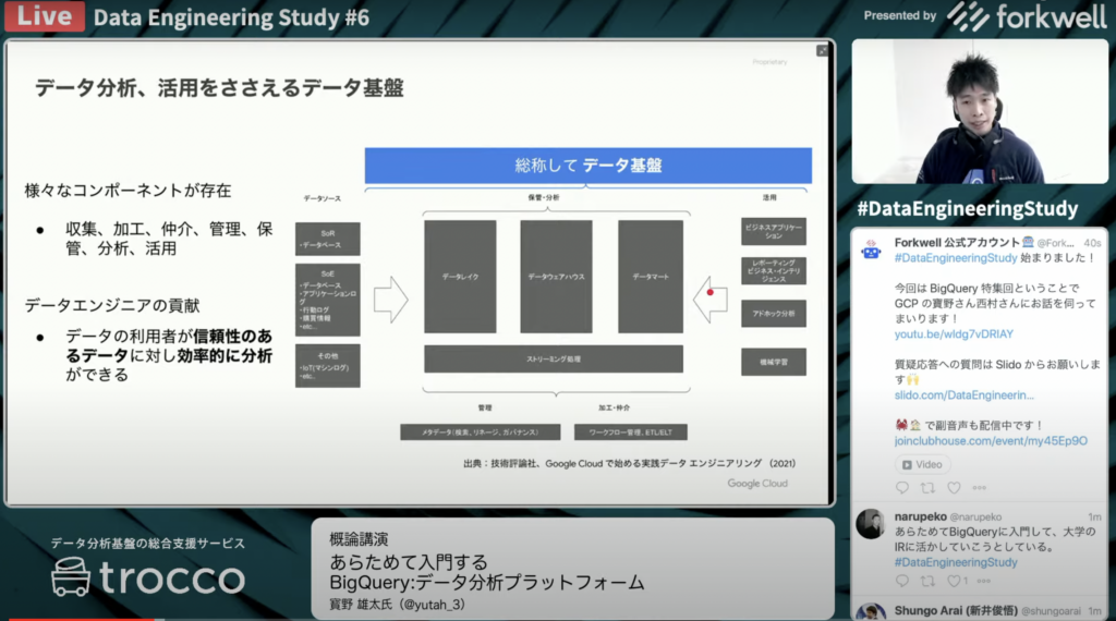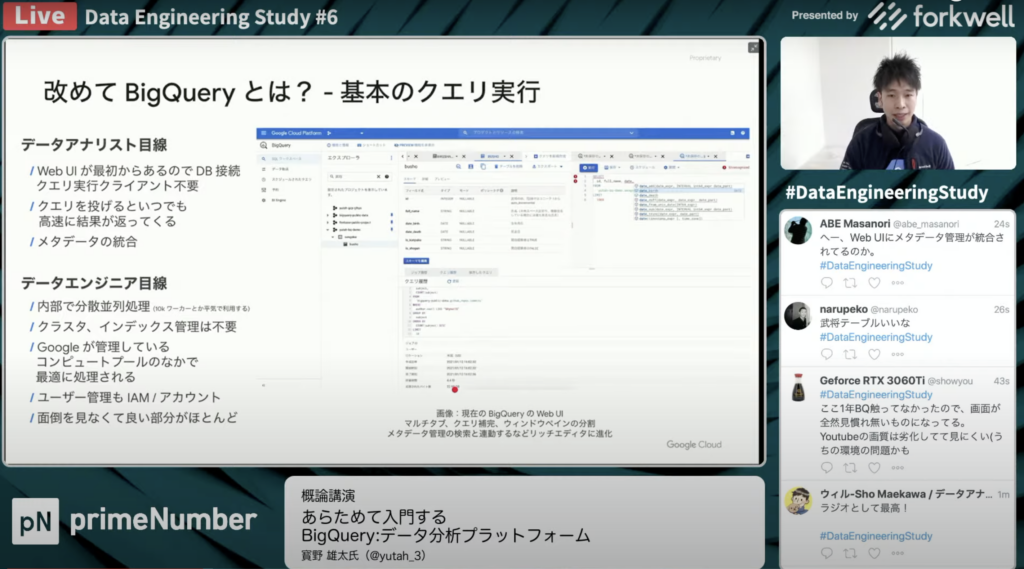 今回第6回は「改めて学ぶ、BigQuery徹底入門」と題し、2名の方々からGoogleが提供するDWHサービス、Google BigQueryの歴史や、BigQueryがビジネスでどのように活用されているのかを学んでいきます。