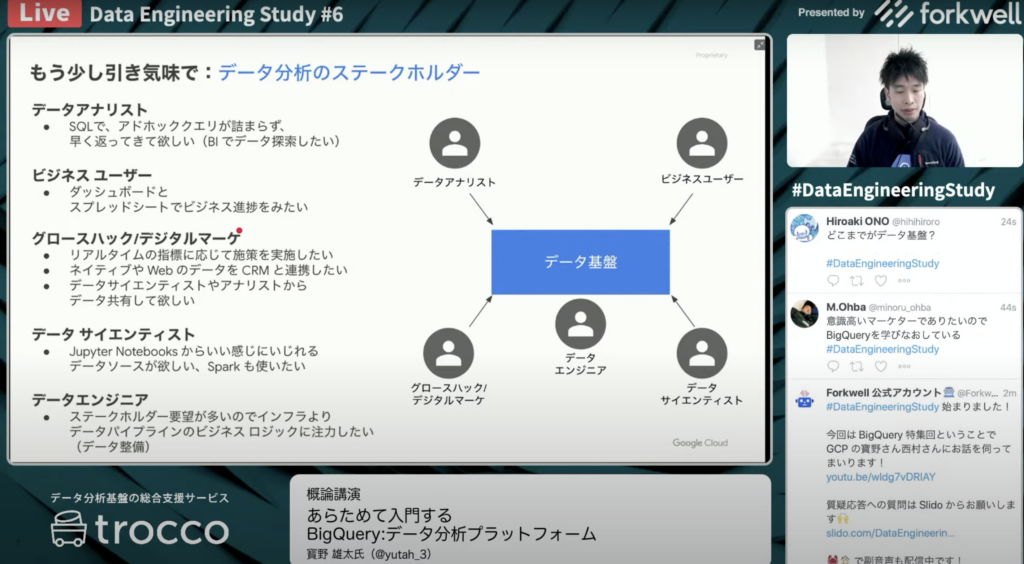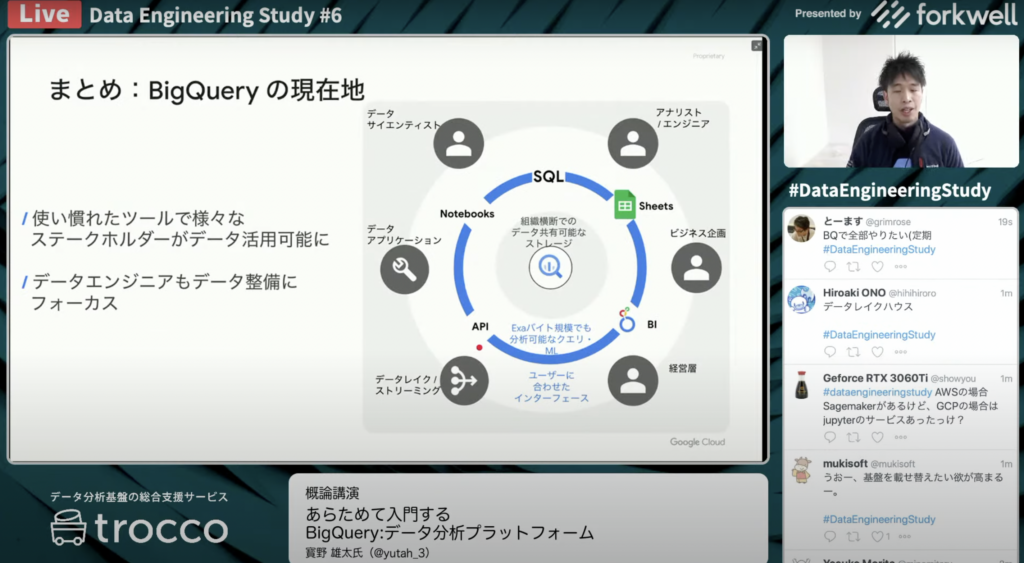 寳野 雄太氏:「データサイエンティスト・アナリスト・そしてビジネス企画の人など、様々な人が使っていけるサービスがBigQueryだと考えています。また、BigQueyをデータエンジニアの方に使ってもらうことで、データ整備にフォーカスしてよりビジネス価値に貢献していけるのではないかと考えています。」