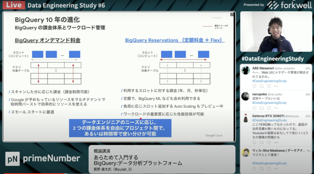 BigQueryはデータエンジニアのニーズに応じて2つの課金体系を用意しており、プロジェクト班によって使い分けたり、時間によって使い分けることもするお客様もいるように、柔軟な課金体系になっています。」
