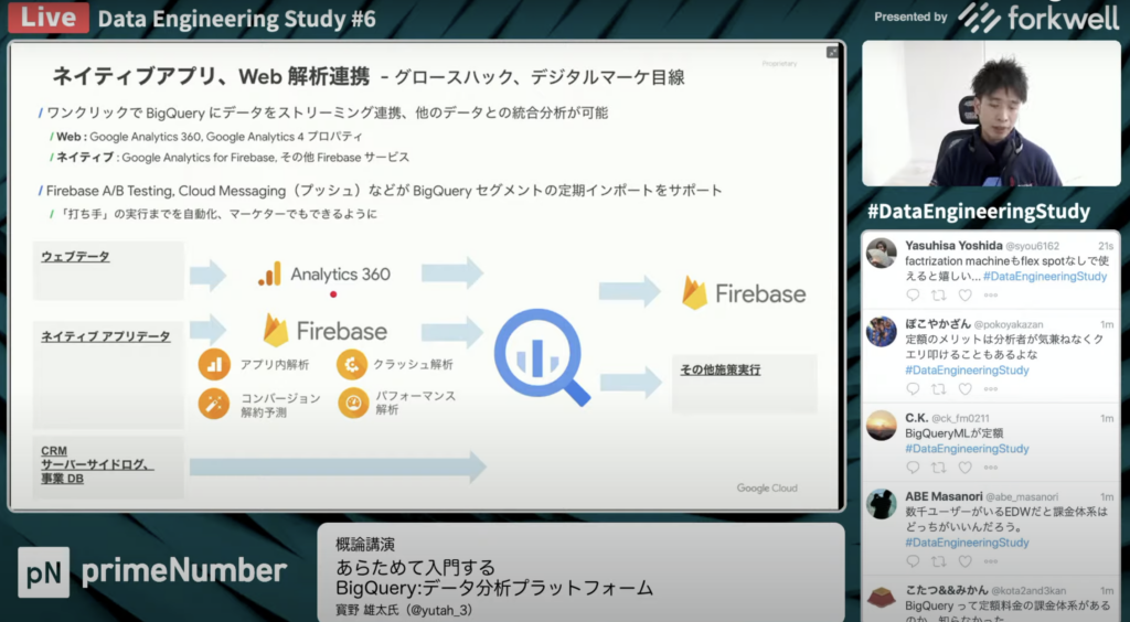 寳野 雄太氏:「BigQueryにはGoogle AnalyticsやGoogle Analytics4 などの解析ツールからワンクリックでデータを連携できる機能がついています。Firebaseと言われるモバイルバックエンドアザーサービス(MBaaS)やアプリケーション内のアナリティクスをワンクリックでエクスポートできます。