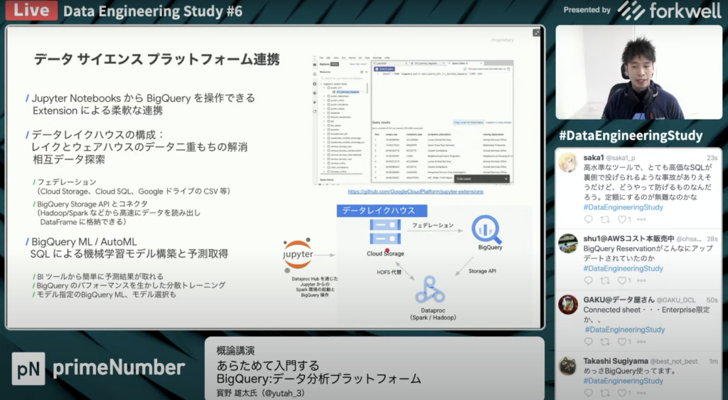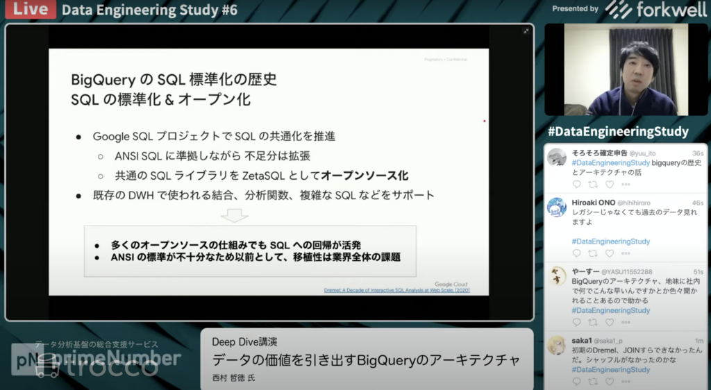 グーグル・クラウド・ジャパン合同会社でデータアナリストをされている西村哲徳氏には、多くの人が使用しているSQLがどのような標準化を経て、BigQueryに進化していったのかをアーキテクチャの仕組みに触れながらお話いただきました。BigQueryの歴史を詳しく知りたい方には勉強になる内容です。