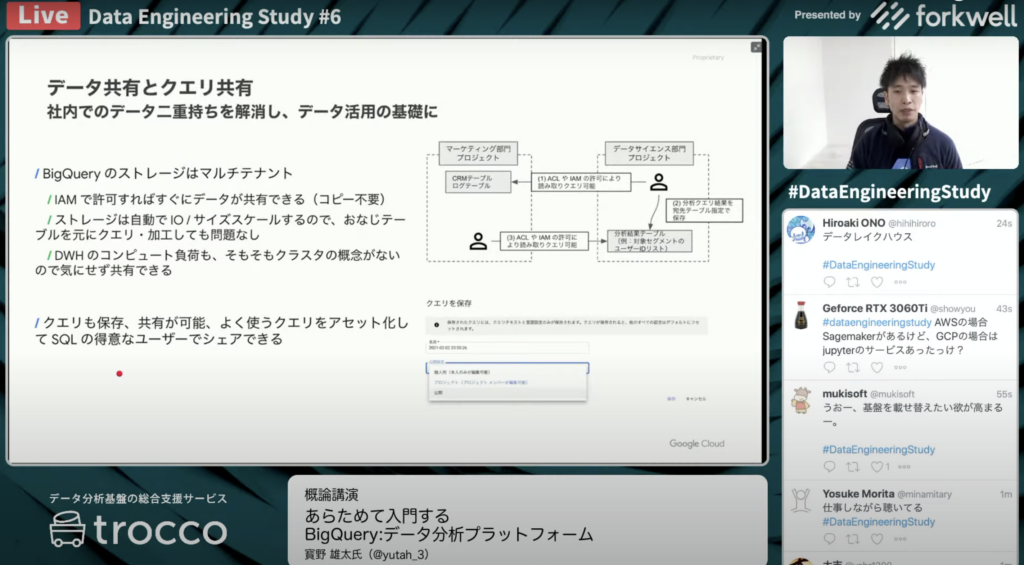 寳野 雄太氏:「BigQueryが人気になった理由として、「データ共有」と「クエリ共有」があります。IAMで許可をすれば、BigQueryに入れたデータはコピーせずに誰でも読み取れるようにできます。