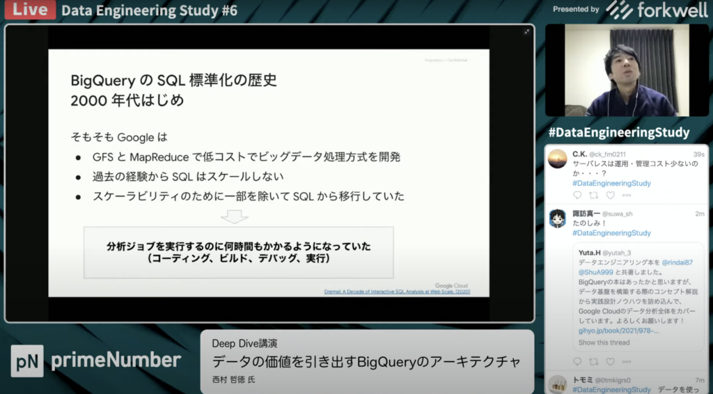 西村 哲徳 氏:「BigQueryは現在では様々なユーザーが使いやすいようになっていますが、そもそもGoogleは2000年代はじめ、SQLはあまりスケールしないという考えだったため、GFSやMapReduceなどの安価なサーバーを並べてデータを処理する開発をしていました。