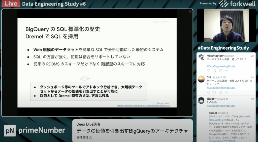 西村 哲徳 氏:「DremelでSQLを採用することで、実行時間の長さの課題を克服できました。DremelはWeb規模のデータセットを簡単にSQlで分析可能にした最初のシステムで、最初から大きなデータを扱えるような仕組みをSQLで扱えたというところがポイントでした。