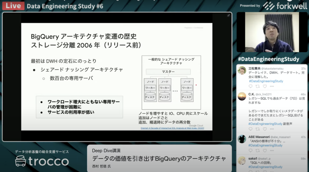 西村 哲徳 氏:「BigQueryがリリースされる前にDremelが開発されていたので、最初はDWHの常識に則って、「シェアードナッシングアーキテクチャ」の数百台の専用サーバでできていました。