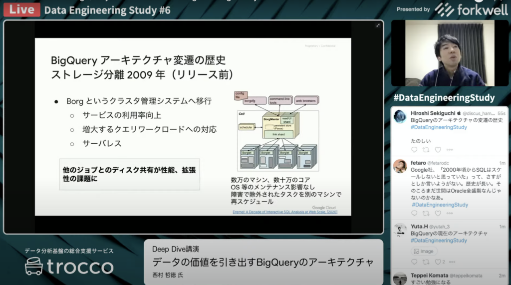 西村 哲徳 氏:「2009年、BigQureryが出る前に、Borgと呼ばれるクラスタ管理システムに移行していきます。