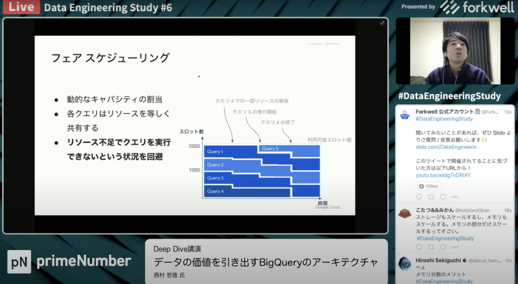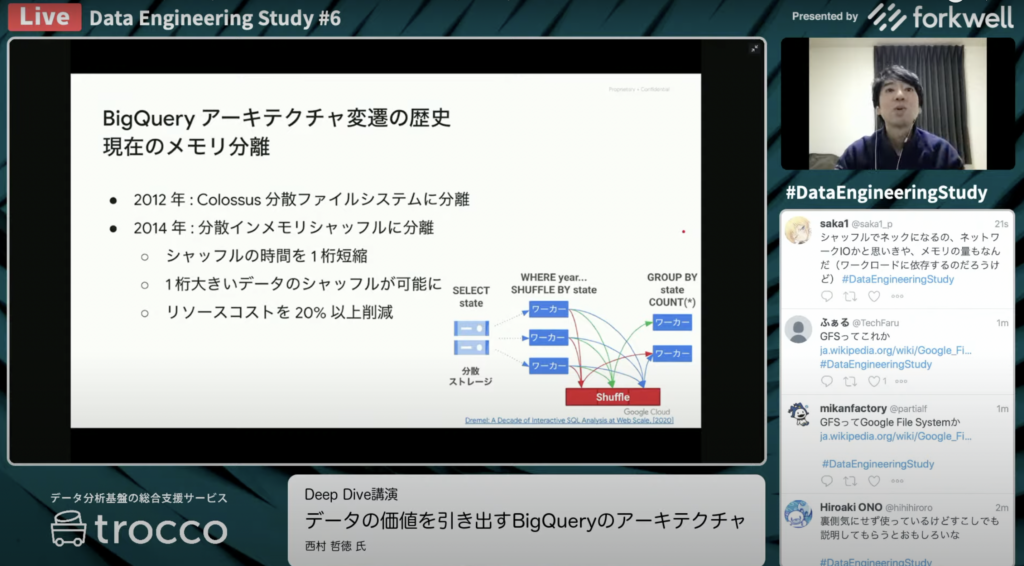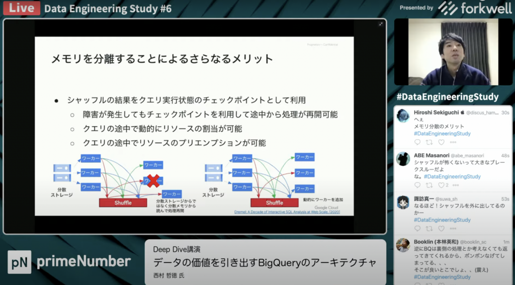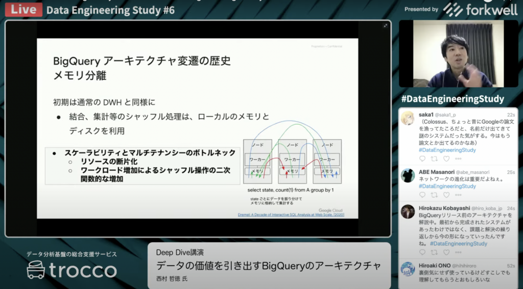 西村 哲徳 氏:「ストレージを分離する仕組みはトレンドになっていて、BigQueryはそこから「メモリ分離」まで機能を拡張させています。コンピュートとストレージのスケールを行ったことで、ネットワーク自体のスケールすることができました。