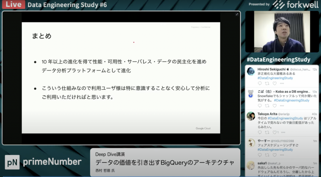 西村 哲徳 氏:「BigQueryは、当初「シェアードナッシングアーキテクチャ」から始まって、様々なところにボトルネックを見つけていって、それらを解消して今のような形になりました。こういった仕組みがあることで、分析プラットフォームとして様々な人に利用してもらえるようになりました。」