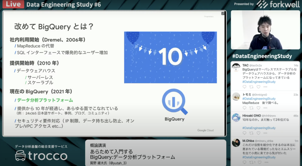 概論講演ではGoogle Cloud内のエンジニアの方をお呼びし、BigQueryのアーキテクチャとユーザーからの要望との関わりについて講演いただきました。