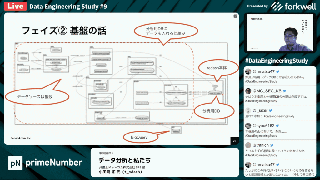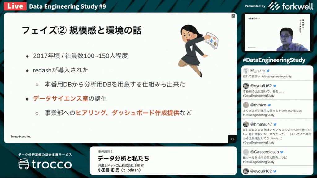 小田島 拓氏:「Redashが導入されたのがフェイズ2としている2017年頃です。社員100名程度になっていました。Redashが導入され、Redashを参照するためのデータべース(分析用データベース)が用意されました。Redashは現在も使っております。