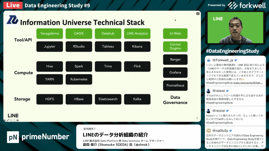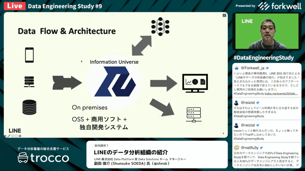 副田 俊介氏:「LINEでは、ユーザーやサービスから発生するデータを、IUと呼び集約しています。IUはInformation Universeの略で、オンプレミスにあるサーバー上でOSSや商用ソフト、独自開発のシステムを組み合わせて実現しています。