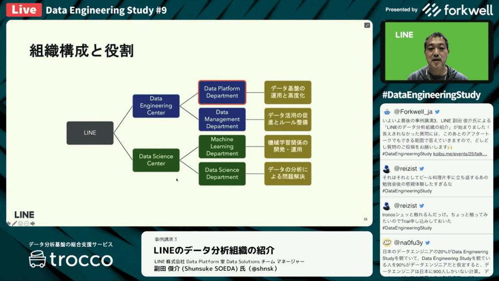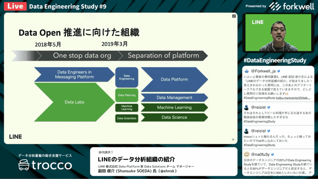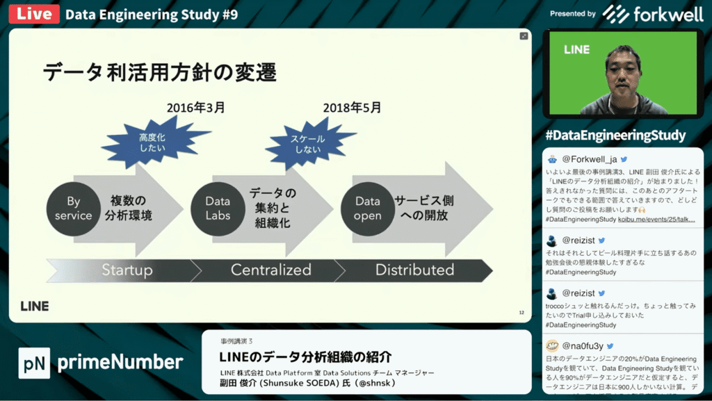 副田 俊介氏:「それまではデータの管理者がデータの利用者でしたが、今度は他のサービスの人も利用するという状況になりました。そうした状況に対応するために、2019年の3月にLINE アプリの基幹開発をしているエンジニアで特にデータ周りを触っているエンジニア組織とData Labsを合併・再編しました。