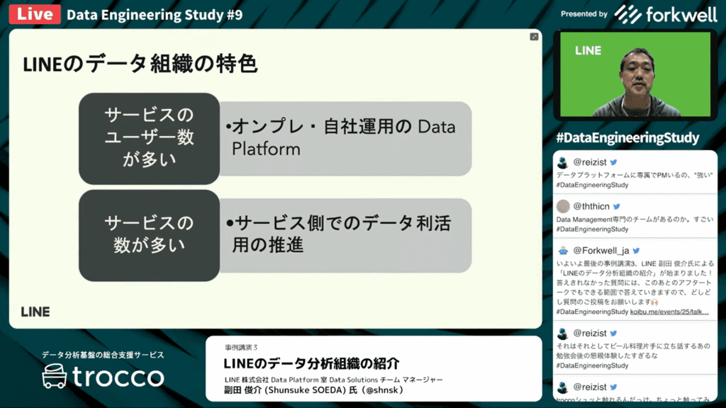 副田 俊介氏:「まとめとして、LINEnoデータ組織の特色としては2点あります。サービスへのユーザー数が多いため、大規模のユーザーから来るデータを扱うべくオンプレミスでデータプラットフォームを構築しており、データプラットフォームのエンジニアリング体制を構築しています。