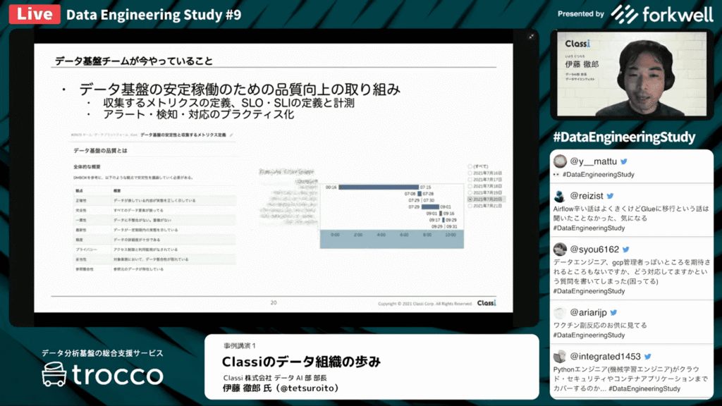 伊藤 徹郎 氏:「データエンジニアリングチームで今やっていることは、第3世代としてデータ基盤開発運用していますが、まだまだ色々と粗があったり品質などをメトリクスとしてSLOやSLIを定義し、それらを収集・計測しています。