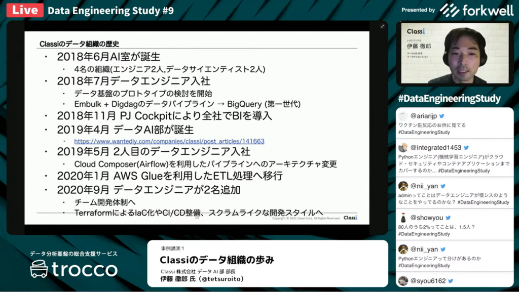 Data Engineering Study第3回では分析基盤をうまく組織に浸透させる方法を学びました。今回は、そうしたデータ分析基盤を構築するデータエンジニア組織にフォーカスし、組織の立ち上げ方や拡大の仕方を学べる勉強会にしていきます。