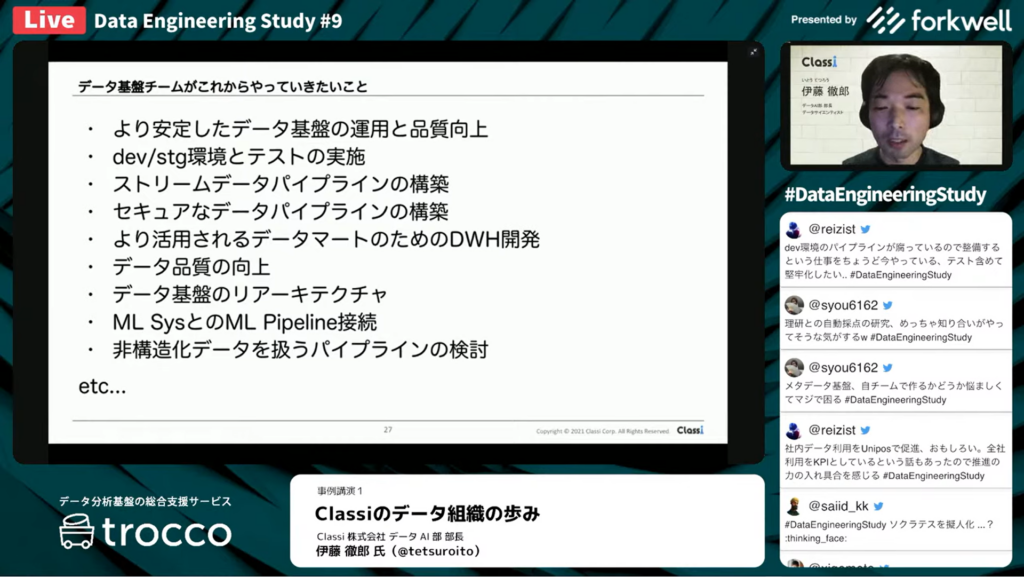 伊藤 徹郎 氏:「データ基盤チームがこれからやっていきたいことは、まずは、より安定したデータ基盤の運用と品質向上、ディベロップ環境・ステージング環境とテストの実施です。その他、ストリームデータパイプラインの構築やセキュアなデータを扱えるパイプラインの構築、より活用されるためのデータマートのためのDWHの開発を考えています。