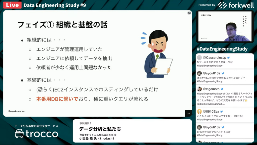 小田島 拓氏:「組織というよりは会議体になりますが、各事業部から数名データに関わる人を集め、SRE室と情報共有を行っています。どのような製品を検討しているのかや作業の進捗共有、新基盤のレビューなどデータに関する話を集約して議論をしたりコミュニケーションが取れたりするようにしています。