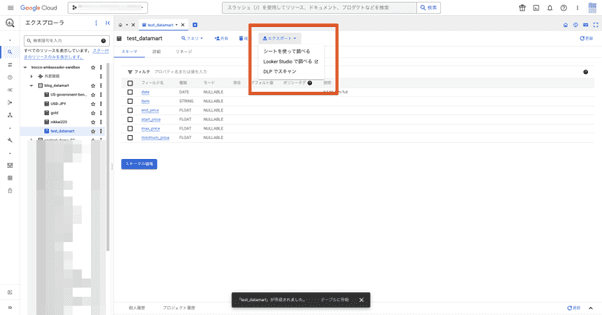 Google BigQueryのコンソール画面から「エクスポート」 → 「Looker Studioで調べる」を選び、データマートとLooker Studioを接続させます。