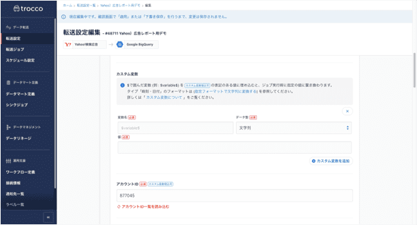 作成したデータの転送ジョブのひとつを編集し、カスタム変数の設定を行います。