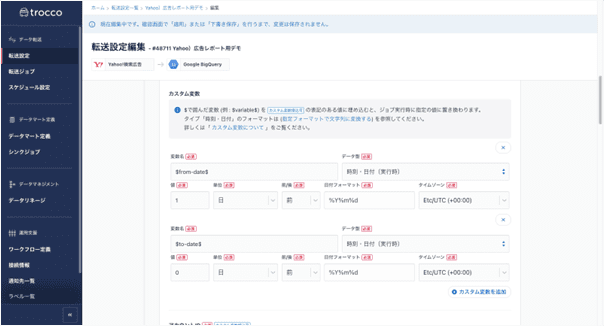 TROCCO®には、転送ジョブの実行時点を基準に、日時のカスタム変数を作成する機能があります。これを利用し、画像のように「一日前」と「今日」を返すカスタム変数を作成します。