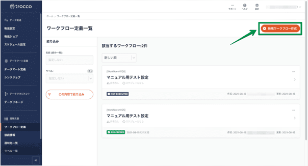 作成したワークフローが一覧で表示されますので、右上の「新規ワークフロー作成」をクリックします。