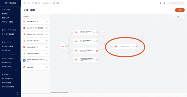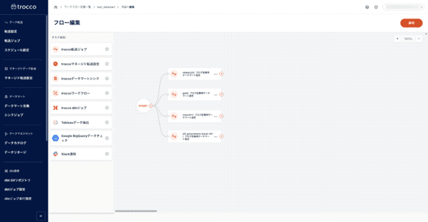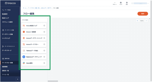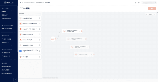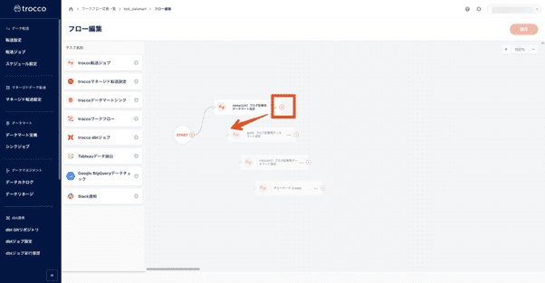 これまでの流れに沿って、まずは「TROCCO転送ジョブ」から4つの転送ジョブをフローチャートに配置します。