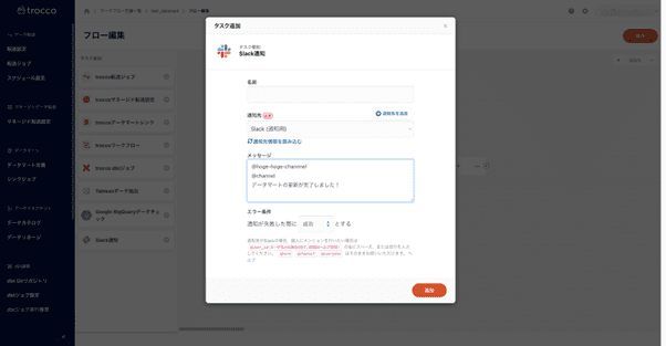 TROCCO®はSlackとの連携にも対応しており、ワークフローの成功/失敗の際に通知を出すことも可能です。
