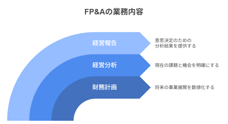 FP&Aの業務は企業の財務戦略を支える3つの主要領域で構成されます。財務計画では将来の事業展開を数値化し、経営分析では現状の課題と機会を明確化します。そして経営報告では、これらの分析結果を意思決定に活用できる形で提供します。