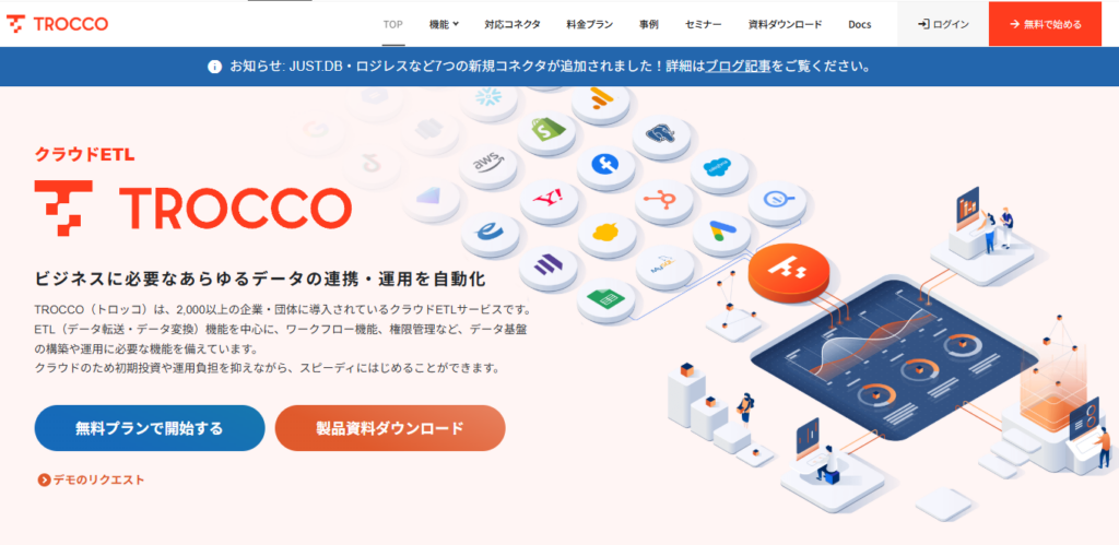 TROCCOは、株式会社primeNumberが提供するSaaS型ETLツールです。GUIを通じて、ノーコード・ノープログラミングでETLパイプラインを構築できる点が強みです。また、複雑な処理が必要な場合は、適宜プログラミングによる独自実装を行えます。