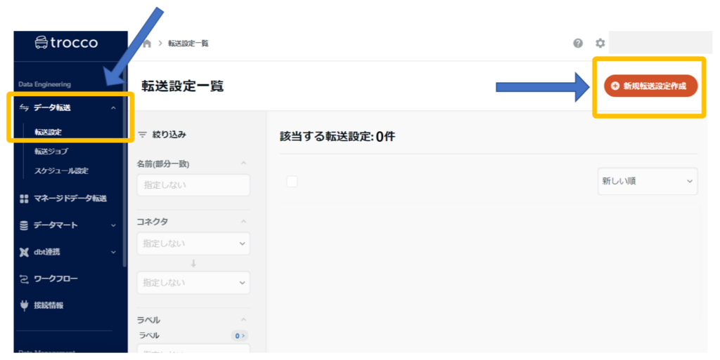 TROCCO®にアクセスして、ダッシュボードの「データ転送」のメニューから「転送設定」を選択し、「新規転送設定作成」というボタンをクリックします。