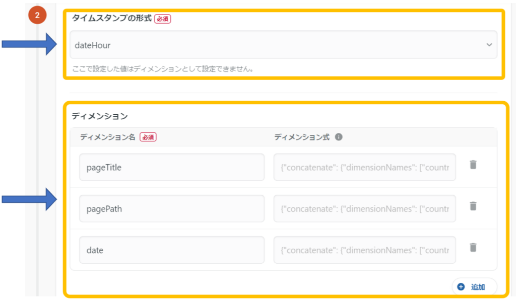 次に、「タイムスタンプの形式」、「ディメンション」、「メトリクス」を設定しましょう。今回は「pageTitle」、「pagePath」、「date」を選択します。