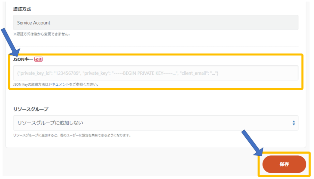 次に、JSONキーを入力し、保存ボタンをクリックします。JSON Keyの取得方法はドキュメントをご参照ください