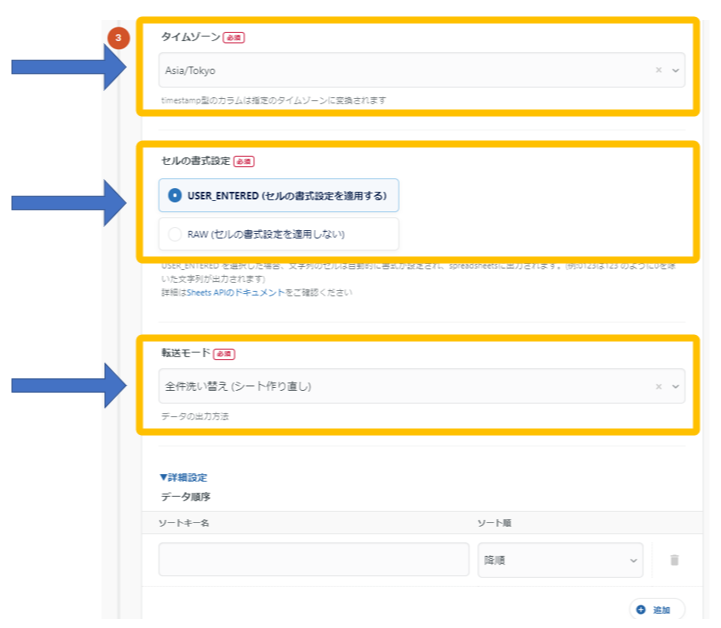 次に、タイムゾーン、セルの書式設定(詳細はこちら)、転送モードを入力します。