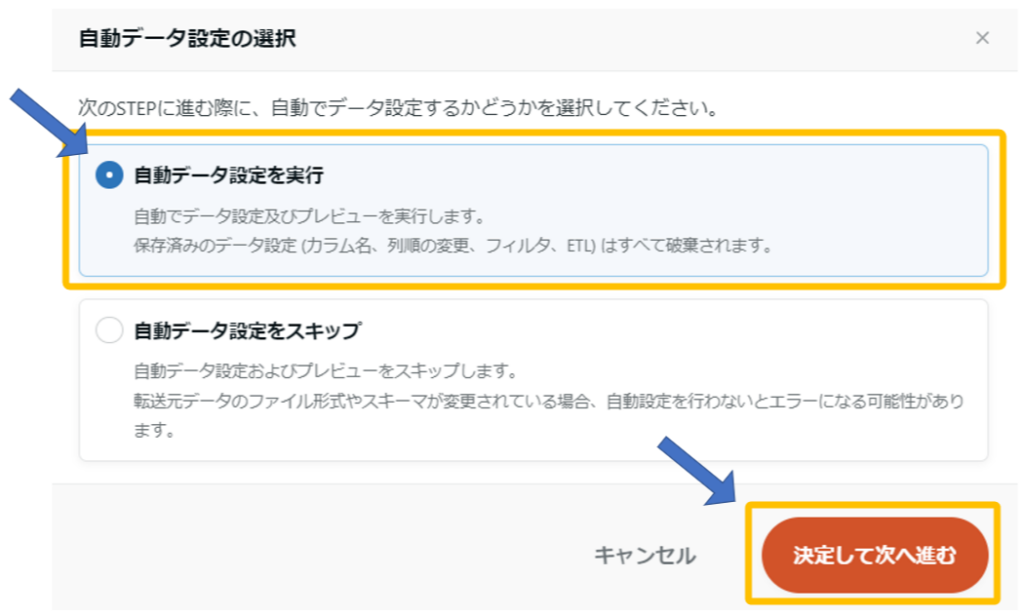 新しく「自動データ設定の選択」画面が現れるので、実行したい内容を選択しましょう。ここでは「自動データ設定を実行」を選択しています。選択後は、「決定して次へ進む」ボタンをクリックしてください。
