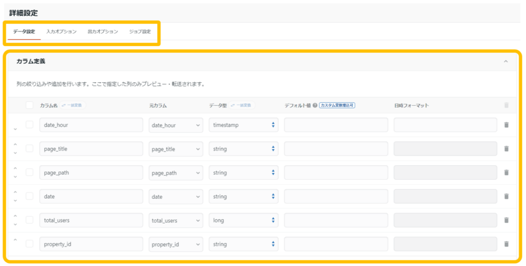 列の絞り込みや追加を行う場合、「詳細設定」の「カラム定義」で調整しましょう。