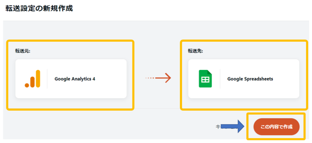 「選択してください」という表記のある部分をクリックするとコネクタの一覧が表示されます。転送元に「Google Analytics 4」、転送先に「Google Spreadsheets」を選択して、「この内容で作成」ボタンをクリックします。