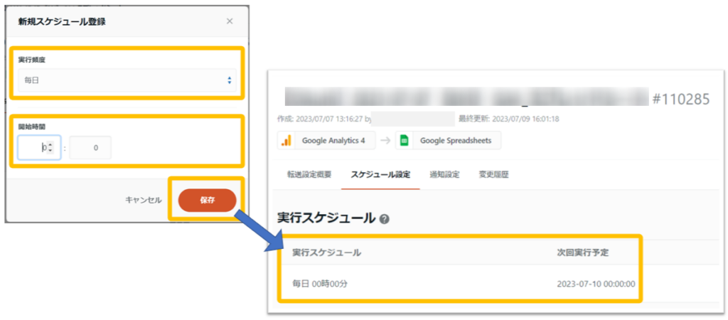 「新規スケジュール登録」で「実行頻度」と「開始時刻」を入力し、保存します。実行スケジュールにスケジュールが反映されていることを確認します。