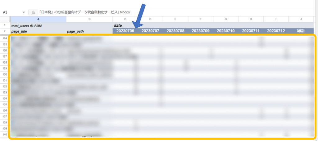 この手順により、各ページ(page_titleとpage_path)について、各日付(date)のtotal_usersの合計が計算され、見やすく整えられました。