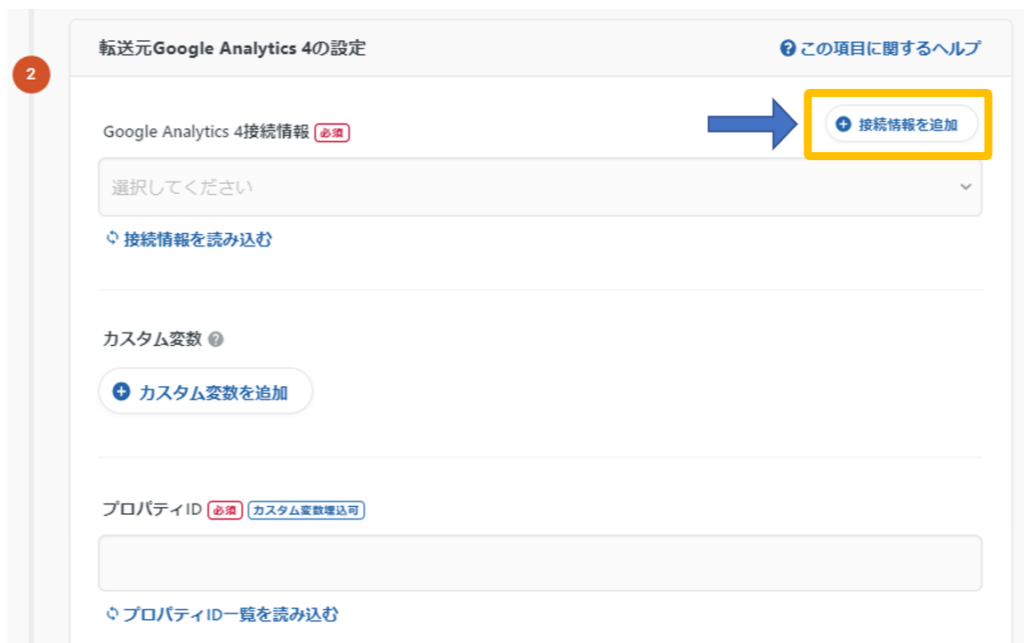 次に「転送元Google Analytics 4」の設定で、「接続情報を追加」ボタンをクリックします。