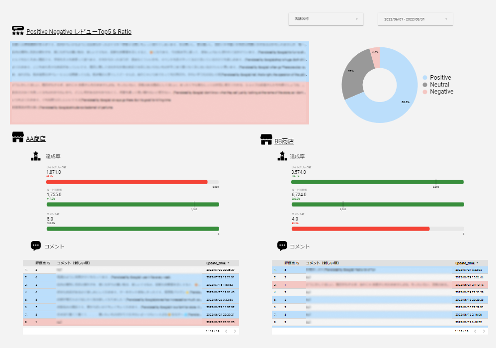 こちらの例では、Googleビジネスプロフィールのデータを活用し、各店舗の情報や顧客からの評価を可視化しています。