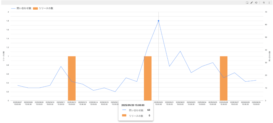 *イメージ例:プレスリリース(棒グラフ:Google Calendarからのデータ)と問い合わせ発生数(折れ線グラフ:フォーム送信数)を掛け合わせて、リリース前後の問い合わせ数を可視化する例