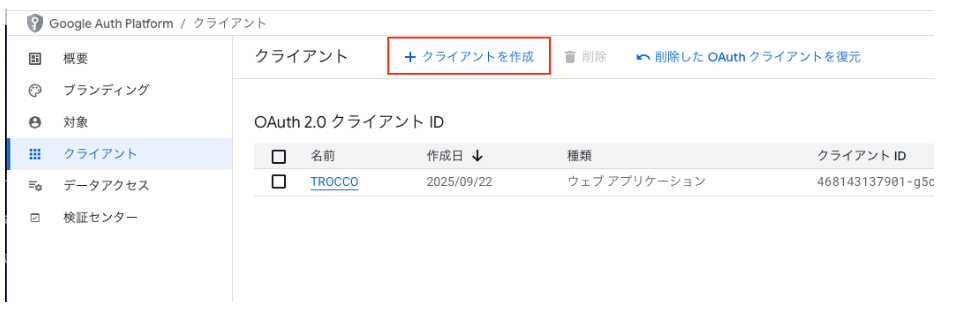 Calendar APIを有効化したら、次に外部から認証を行うためのクライアントを「Auth Platform」で作成します。「クライアント」メニューから「クライアントを作成」をクリックします。